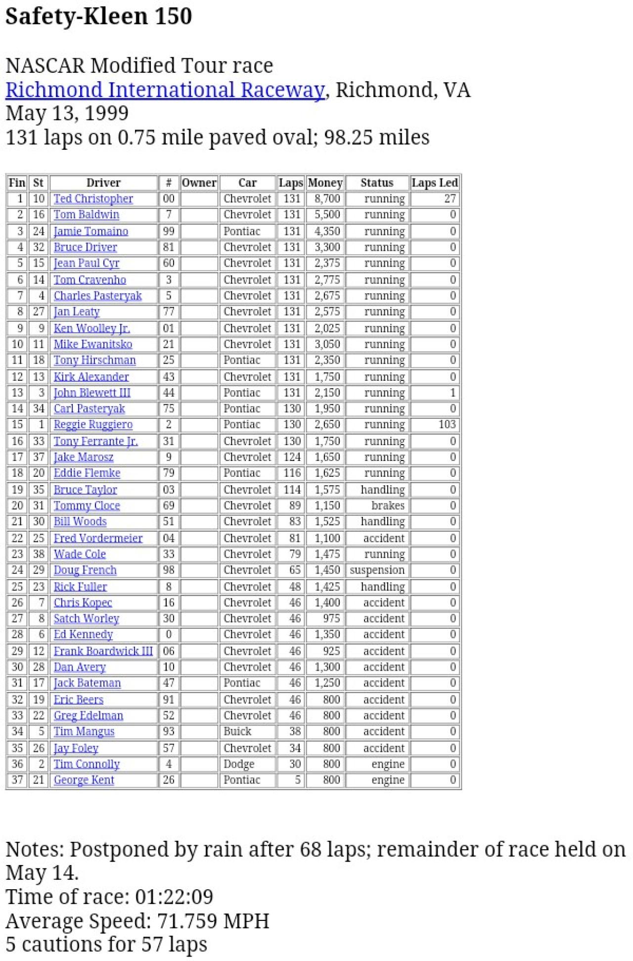 Ted Christopher won the final race I ever worked - the Safety Kleen 150 NASCAR Modified Tour event on Friday night, May 13, 1999 over Tiger Tom Baldwin in our "house car" at Richmond International Raceway in Richmond, Va. Two drivers gone way too soon. Condolences to Ted's family and friends.