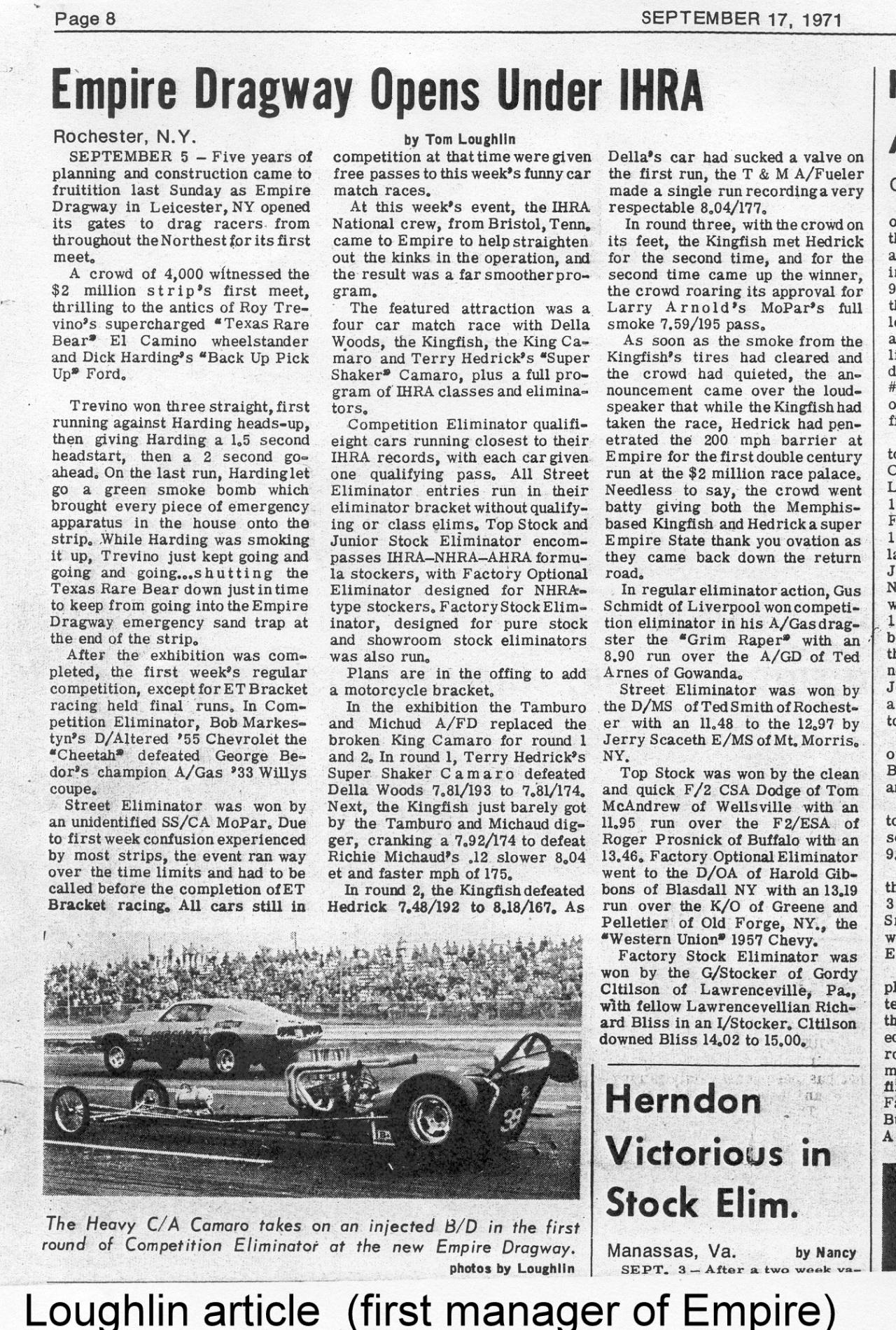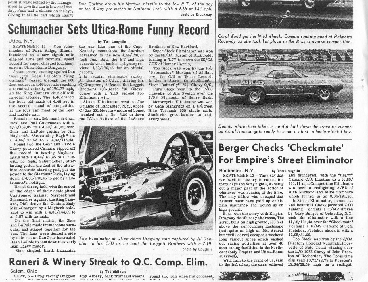 Lynn, I would like your permission to post the photo below on my facebook page with credit to you for it and your story about Behling. I want to show my followers just how GREAT a view (AND SNIFF) we used to get at UTICA ROME of the baddest cars in the USA. I hope that every time the tale of UTica Rome is told, that Dick Waterman will get proper credit for bringing in the best shows that any little local eighth has ever seen...and he DID.