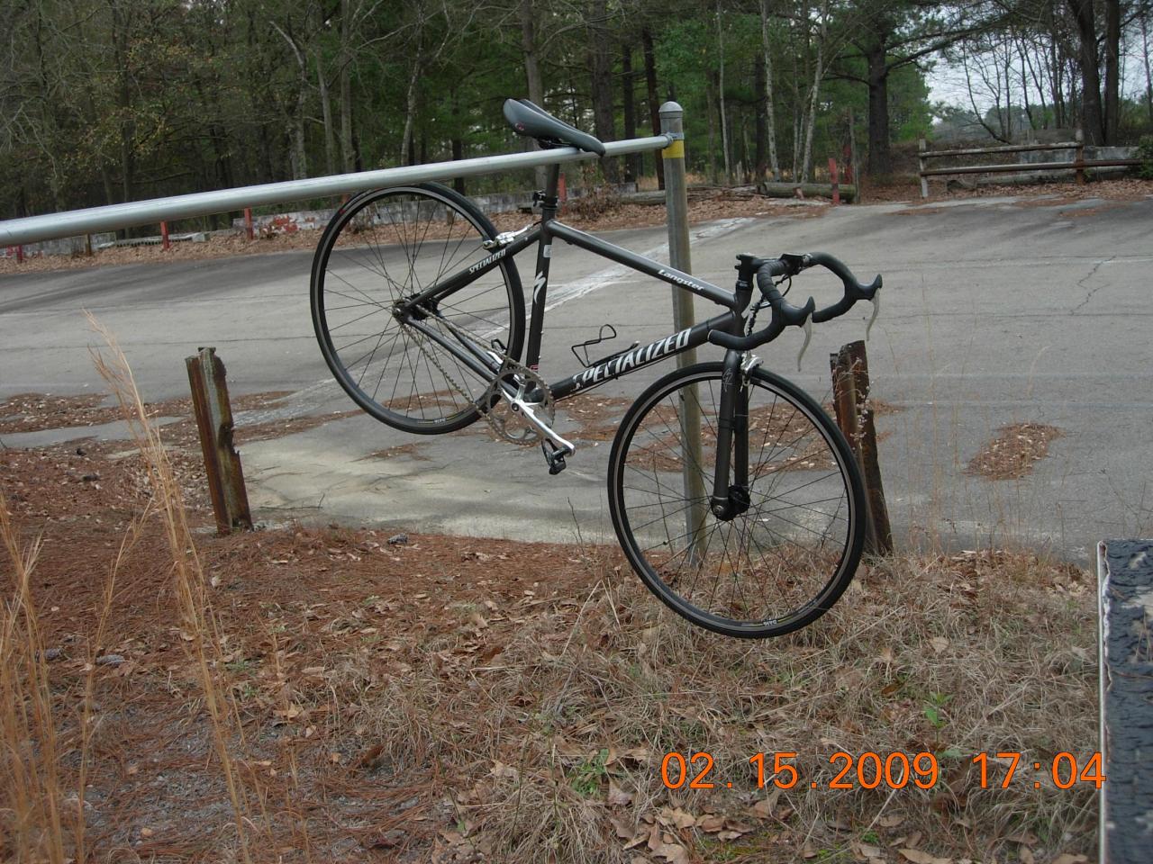 Picture is my Langster fixed gear bicycle on the bike rack at the Old Columbia Speedway. That is the start-finish line in the front straight away in the back ground. Note: the chain is so clean because it is new.